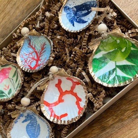 Bring a touch of coastal elegance to your holiday celebrations with our Christmas ornament sets, featuring our best-selling Trinket dish prints on mini Florida scallop shells. Each ornament is one-of-a-kind, showcasing unique designs that capture the beauty of the coast. Sealed in resin and delicately trimmed in gold leaf, these ornaments are not only stunning but durable, ensuring they’ll become a cherished part of your holiday decor for years to come.