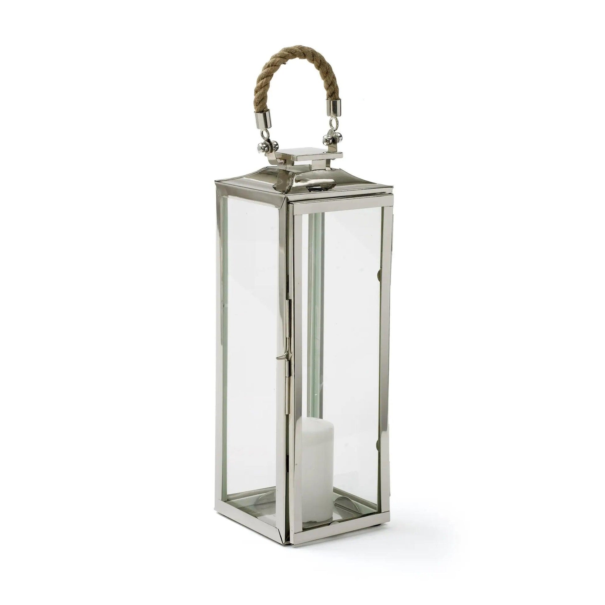 Add a coastal glow to your space with our Hurricane Lanterns! Standing tall at 26" with the handle, this beautifully crafted lantern brings the perfect mix of rustic charm and modern sophistication. Made from polished nickel, brass, glass, and accented with rope, it’s designed to reflect your coastal style while adding warmth to any room or outdoor setting.